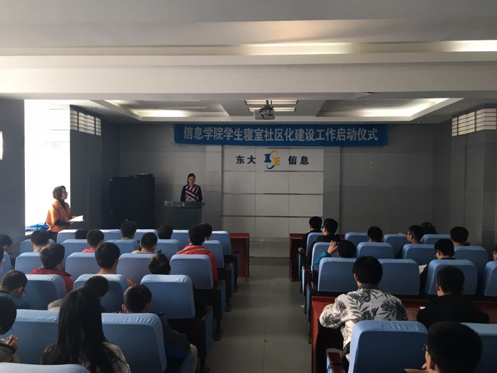启动仪式于12月2日在信息学馆301举行,会议由学办2016级本科生辅导员宋晓艳老师主持,学生工作办公室主任李世鹏老师介绍了《信息科学与工程学院学生寝室社区化建设方案(试行)》;学院学生寝室社区化建设服务中心主任、2014级本科生张子荷代表事务中心全体成员发言,介绍了中心的工作职能、表达了为各社区做好服务工作的决心;五舍第八社区主任、2015级学生支元祺同学代表社区主任谈了工作设想;学院党委副书记、副院长吕兴君老师再次明确了本项工作的重要意义、并对各社区负责人提出工作要求。