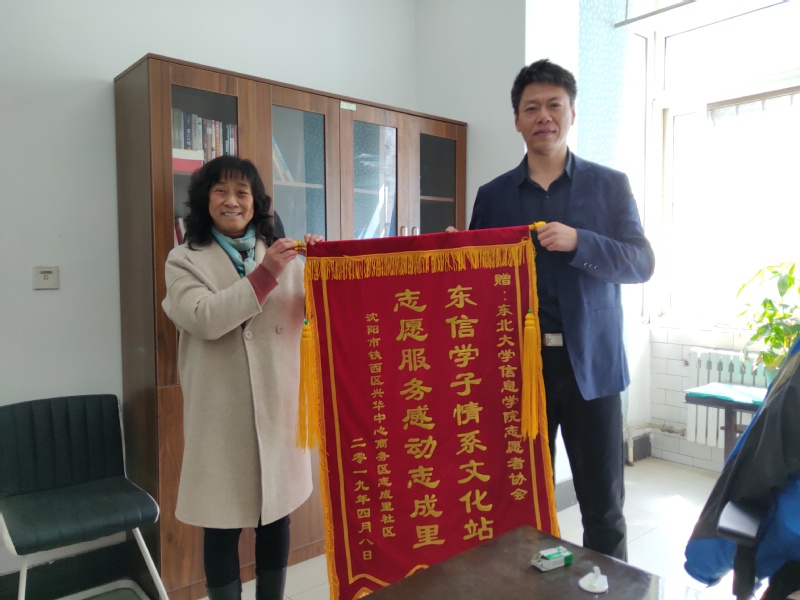 4月8日上午,沈阳市铁西区志成里社区王华书记为学院送来一面绣着“东信学子情系文化站,志愿服务感动志成里”的锦旗,感谢学院学子长期以来为志成里社区建设作出的积极贡献。