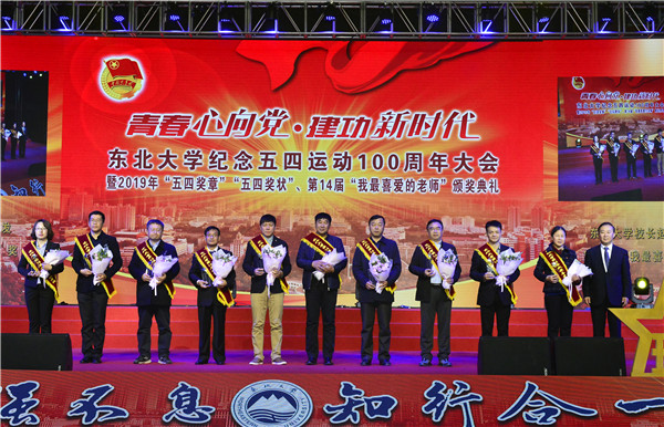 4月29日晚,“青春心向党·建功新时代”东北大学纪念五四运动100周年大会暨2019年“璀璨星光”东大青年奋斗的青春故事会(第五季)在刘长春体育馆召开。大会表彰了2019年全校获得“五四奖章”的优秀个人和“五四奖状”的先进集体,并为第14届“我最喜爱的老师”获得者颁奖。