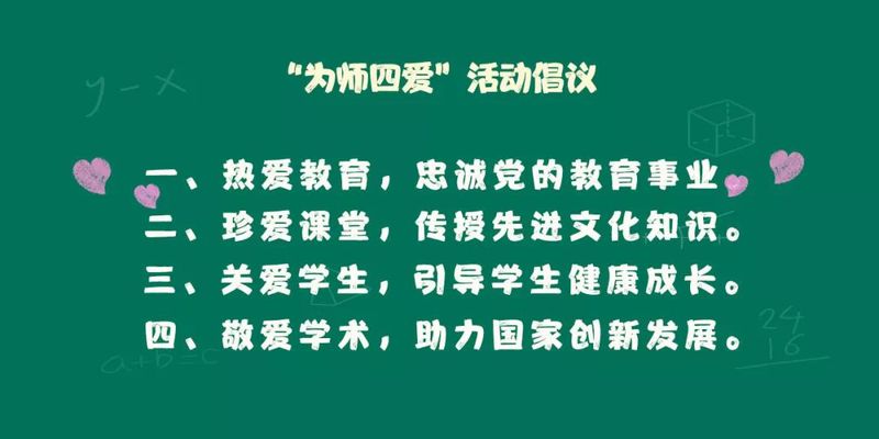 今年9月10日是我国第35个教师节。习近平总书记指出:“教师是立教之本、兴教之源。”教师是太阳底下最光辉的职业,选择了教师就选择了奉献。9月6日,我校学生发出“服务中见敬意、问候中见敬爱、守纪中见敬重、勤学中见敬仰”“尊师四敬”活动倡议。面对学生们的真挚感情,作为教师,我们要坚守教育初心和使命,落实立德树人根本任务,做党和人民满意的好教师。在全校上下深入开展“‘庆祝新中国七十华诞,弘扬新时代尊师风尚’2019 年教师节系列活动”之际,我们特向全校教师发出“为师四爱”倡议: