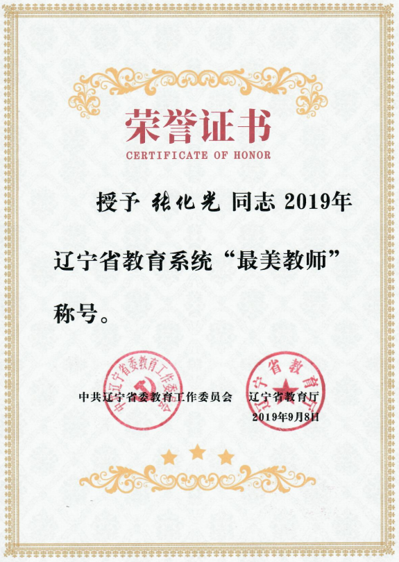 在新中国成立70周年和第35个教师节来临之际,为进一步弘扬尊师重教的良好风尚,增强广大教师、教育工作者的荣誉感和责任感,吸引更多更优秀人才投身教育事业,推动教育事业科学发展,省委教育工委、省教育厅决定在全省教育系统开展“最美教师”评选活动。9月8日,辽宁省庆祝2019年教师节暨“最美教师、最美校长、最美园长”颁奖大会在沈阳召开。会议宣读了辽宁省委教育工委、省教育厅《关于表彰辽宁省教育系统“最美教师、最美校长、最美园长”的决定》,学院张化光教授荣获2019年辽宁省教育系统“最美教师”称号。