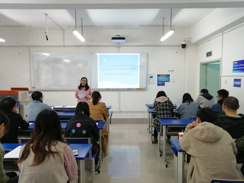 10月18日中午,学院在大成教学馆116教室召开了2019年第二期发展对象入党前集中培训学风及考风教育动员会。学院党委组织员刘宇出席并主持了动员会,2019年下半年发展对象43人全部参加会议。