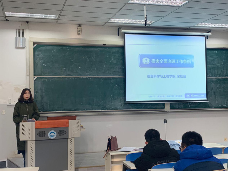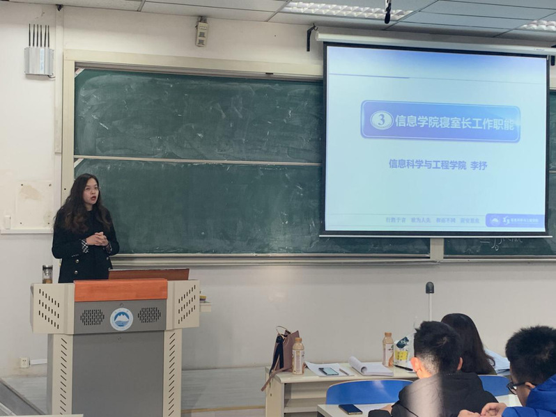 李抒介绍了寝室长职责,并表示寝室长作为基层学生干部,发挥着至关重要的作用。寝室是学生每天学习生活的场所,寝室的卫生以及安全环境关乎学生在东北大学的生活质量以及人身健康安全,寝室同时是学校与学院各项活动以及信息上传下达的最后关节。寝室长负责寝室卫生、安全、学习环境等各方面建设,要时刻监督寝室成员,积极履行职责。