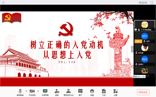 在座谈讨论环节,2018级硕士生张子荷、安晓东、王博,2019级硕士生杨婉婷、王德睿、柳梦琳,2017级本科生白羽、史博文、于子洋、李昊佳等10名同学作为发展对象代表进行交流分享,他们结合战地日记、先锋故事等内容的学习心得,围绕“如何树立正确的入党动机,从思想上入党,做一名合格的共产党员”进行讲述,并表示入党绝不仅仅是一份荣誉,更是责任和使命,要经得起各种考验,最终实现从思想上入党。