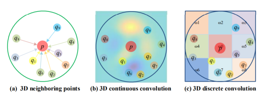 三维连续卷积网络的方法在连续空间上定义卷积核,其中相邻点的权重与相对于中心点的空间分布相关。三维卷积可以解释为在给定的子集上加权和,MLP是学习权重的简单方法。三维离散卷积网络,这些方法在规则网格上定义卷积核,其中相邻点的权重与相对于中心点的偏移有关。