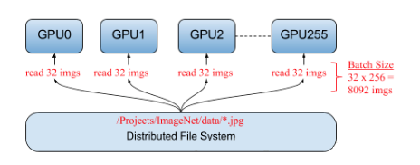 数据并行就是在很多设备上放置相同的模型,并且各个设备采用不同的训练样本对模型训练。训练深度学习模型常采用的是batch SGD方法,采用数据并行,可以每个设备都训练不同的batch,然后收集这些梯度用于模型参数更新。Facebook训练Resnet50就是采用数据并行策略,使用256个GPUs,每个GPU读取32个图片进行训练,如下图所示,这样相当于采用非常大的batch(256×32=8192)来训练模型。