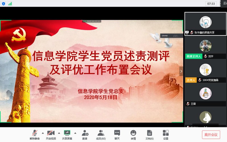 会前,学院学生党总支按照学校、学院党委要求,结合学院学生党建工作实际及新冠肺炎疫情防控情况,制定了《信息学院2020年学生党员述责测评及评优工作实施细则》。刘宇在工作布置会议上将述责测评的时间安排、工作流程等进行详细解读,要求各学生党支部和班级认真传达文件精神并组织实施,并将东北大学先进学生党支部、东北大学优秀学生党支部书记以及东北大学优秀学生共产党员的评选条件、申报程序、推荐评审等环节进行部署,要求大家通过支部党员大会将本次会议精神通知到每一名党员,力求将述责测评和评优两项工作公开严谨、扎实有序地推进落实。