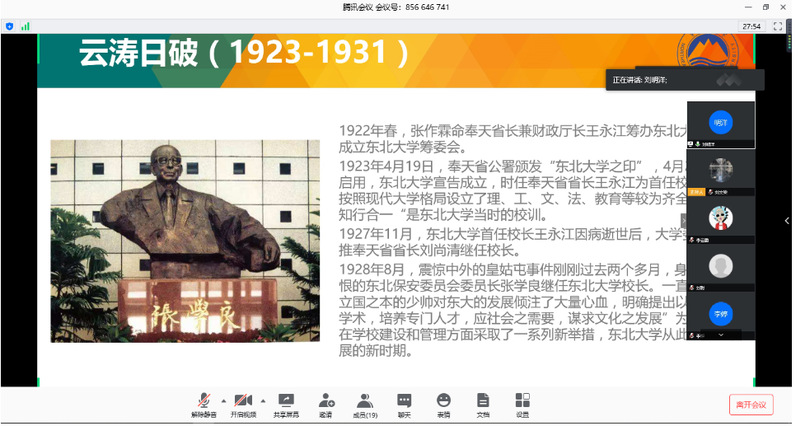 为弘扬爱国主义情怀,引导青年学生党员了解东大校史、讲好东大故事,5月25日,学院2019级硕士生第二党支部开展了“回顾光辉校史,传承爱国精神”线上学习分享会。本次分享会由党支部宣传委员刘文梁主持,支部全体党员参加会议。