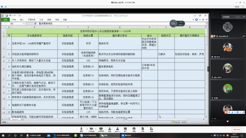 5月26日,工作小组召开第二次专题工作(网络)会议,工作小组将45项安全隐患合并整理成33项待整改问题,主要涉及24小时不断电设备的消防安全、教师借用实验中心实验室手续、浑南校区实验室供暖期的防水安全、个别实验室的吊棚需求、灭鼠需求等。针对上述问题工作小组逐一讨论确定解决方案,为确保每一项整改工作能够解决、落实到位,还明确了分类整改负责人,由负责人负责具体整改工作。