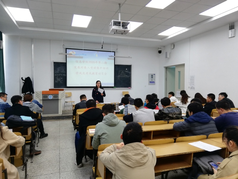 10月16日中午,信息学院学生党总支在何世礼教学馆110室召开2020年第二期发展对象入党前集中培训学风及考风教育动员会。学院党委组织员刘宇出席并主持会议,2020年下半年发展对象62人全部参加会议。