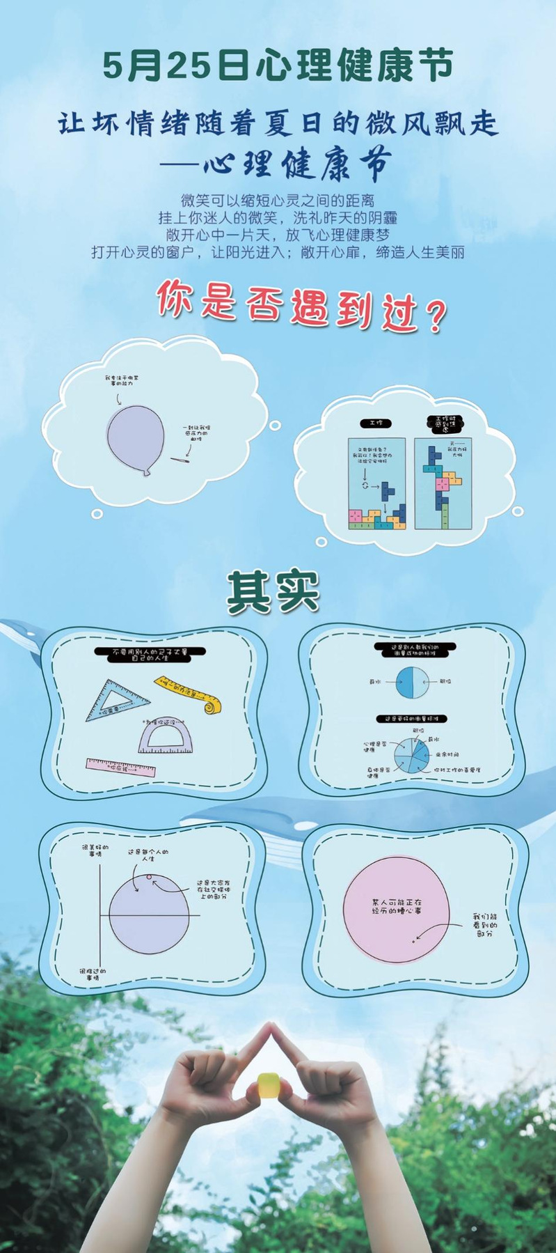 5月25日是全国大学生心理健康日,信息学院举办了“让坏情绪随着夏日的微风飘走——心理健康节”主题活动,旨在提高研究生对自身心理健康的重视程度,帮助研究生正确解决心理问题、缓解心理压力。活动通过宣传海报展示了缓解压力、愉悦心情、消除坏情绪的各种方法,同时设置心理健康答题环节,鼓励同学们参与到各类常见心理问题的解答中来。