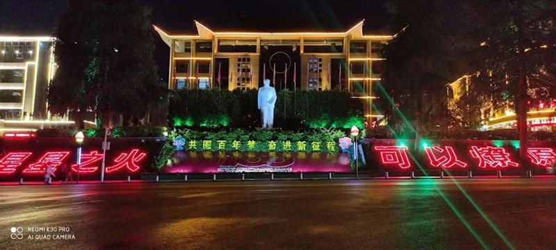 深夜的茨坪,这儿是当年井冈山革命斗争的中心。这儿红色气氛浓郁,路灯是经过精心设计的红色火苗形状,景区中心设有毛主席雕像,“星星之火,可以燎原”与历史相呼应,让井冈山精神更加深入人心。