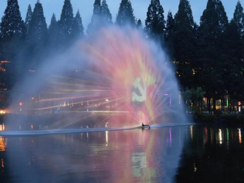 夜幕降临时,挹翠湖中心放起水幕电影,红色电影在水幕上投放吸引了无数游客。水幕电影形式新颖,主题深刻,趣味十足地将井冈山精神带到我们的身边。
