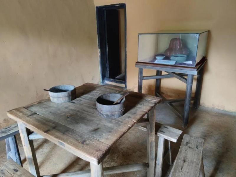 茨坪东山脚下的杂货铺,房东腾出一半给红军居住,朴实的土培房,温馨的农家院。毛泽东同志的房间很小,设施很少,只有一张小床、一张书桌和一副黑得发亮的箩筐,吃饭的地方也是最朴素的几张桌椅。这个狭小的房间承载着革命最初的光荣和梦想,晚上写作,白天打仗,有时还会和红军战士一起去背粮。