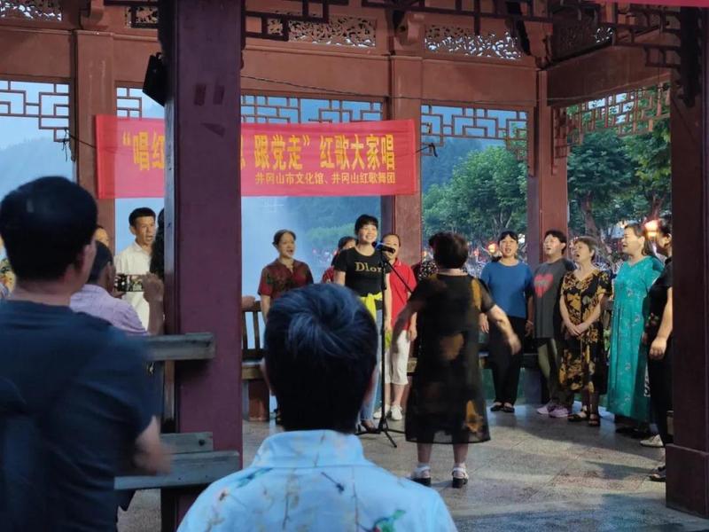 傍晚时分,挹翠湖公园附近,调研团感受当地的红色文化以及风土人情。井冈山在红色文化建设以及传承上倾注心力,公园的亭子里正在举办“唱红歌 感党恩 跟党走”红歌大家唱活动,当地人民热情参加,慷慨激昂的红歌回荡在挹翠湖畔,现场观众反应热烈。