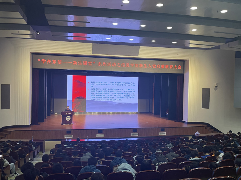 10月27日,信息学院在汉卿会堂举行“学在东信——新生课堂”系列活动之信息学院新生入党启蒙教育大会,学校党委组织部组织员王海霞、信息学院学生工作办公室相关人员及全体新生参与此次大会。