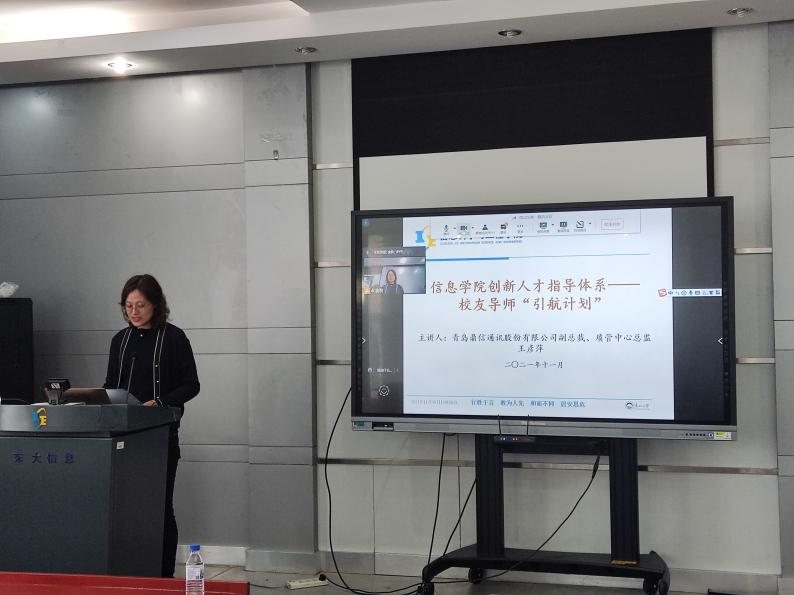 11月18日,信息学院在信息学馆301室开展校友导师“引航计划”行业前沿报告会,信息学院2000届自动化本科毕业生、青岛鼎信通讯股份有限公司副总裁、质管中心总监王彦萍应邀作了题为“做最好的自己——认知自我及芯片基础知识普及”的报告,信息学院党委副书记兼副院长亓红强、学生工作办公室相关老师参加本次活动,2021本科生以线上线下相结合的方式参与。