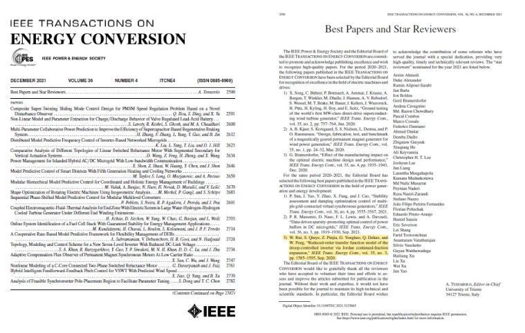 IEEE Transactions on Energy Conversion于1986年创刊,目前为中科院工程技术大类一区期刊,JCR一区期刊,电子与电力领域Top期刊。2020—2021年度,该期刊从发表的463篇论文中共选出6篇Best Paper。这是我校首次获得该奖项,标志着我校电气学科在该领域取得重要进展。