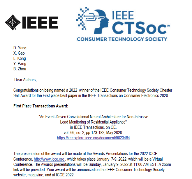 1月10日,2022IEEE 40thInternational Conference on Consumer Electronics(ICCE)大会颁发了2020年度IEEE Transactions on Consumer Electronics(IEEE消费电子会刊期刊)的最佳论文奖——Chester Sall Memorial Award。信息学院杨东升教授(第一作者)、博士生高筱婷(通讯作者)、博士生庞永恒、周博文副教授联合国网九江供电公司孔亮完成的论文《An Event-Driven Convolutional Neural Architecture for Non-Intrusive Load Monitoring of Residential Appliance》(面向居民用电非侵入式负荷监测的事件驱动卷积神经网络架构)获得了1st Place Best Paper Award(最佳论文奖第一名)。