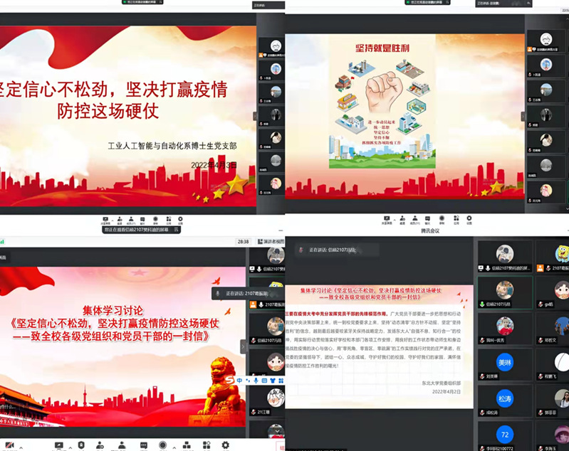 校园封闭管理后,学院工业人工智能与自动化系博士生党支部第一时间迅速反应,吹响号角,向全体东信学子发出“筑牢防线,共克时艰,全力打赢疫情防控阻击战”倡议,号召全体学生做强化“政策-意识”双堡垒的清醒者,做落实“疫情-科研”双驱动的行动者,做实现“自控-群控”双提质的引领者,用青春构筑校园疫情防控的坚实堡垒,为打赢疫情防控阻击战贡献力量。倡议一经发出,同学们积极响应,进一步明确了同心抗疫、冲锋在前的决心与目标。