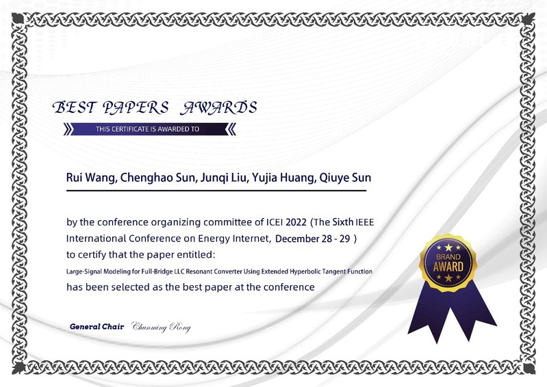 2022年12月29日,IEEE International Conference on Energy lnternet (IEEE国际能源互联网大会)在挪威胜利闭幕,信息学院青年教师王睿(第一作者)、博士生孙城皓、本科生刘俊琦、博士生黄雨佳、孙秋野教授完成的论文《Large-Signal·Modeling·for·Full-Bridge LLC·Resonant Converter Using Extended Hyperbolic Tangent Function》(基于拓展型双曲正切函数的LLC变换器大信号建模)获得了Best Paper Award (最佳论文奖)。IEEE国际能源互联网大会每年仅评选1篇最佳论文奖,本次获奖是中国大陆学者首次获此殊荣。这是我校首次获得该奖项,标志着我校电气学科在该领域取得重要进展。