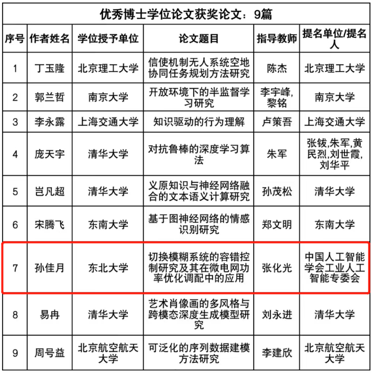 3月14日,中国人工智能学会发布《2022年度吴文俊人工智能科学技术奖奖励公告》,60项成果获2022年度“吴文俊人工智能科学技术奖”,信息学院青年教师孙佳月以毕业论文“切换模糊系统的容错控制研究及其在微电网功率优化调配中的应用”获得优秀博士学位论文奖。