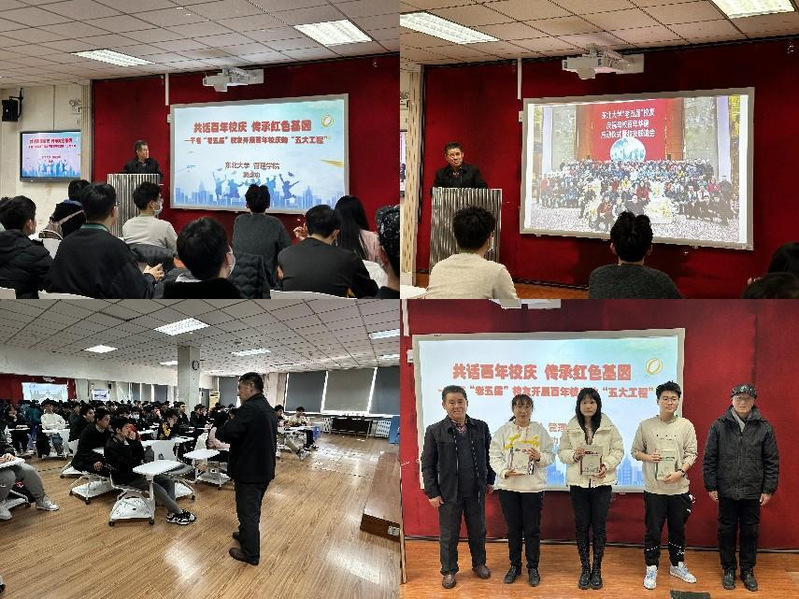 近日,信息学院启动庆祝东北大学建校100周年之“传承老科学家精神”系列讲堂活动。校关工委常务副主任、信息学院“三全育人”学生成长导师窦胜功老师应邀在学生活动中心300室作了题为“共话百年校庆,传承红色基因”的首场报告,并向学院团支部赠送“老五届”学长们的经典之作——百年校庆文集《白山黑水壮我行》《东大老五届诗词选》和《东大老五届校友书画作品选》。