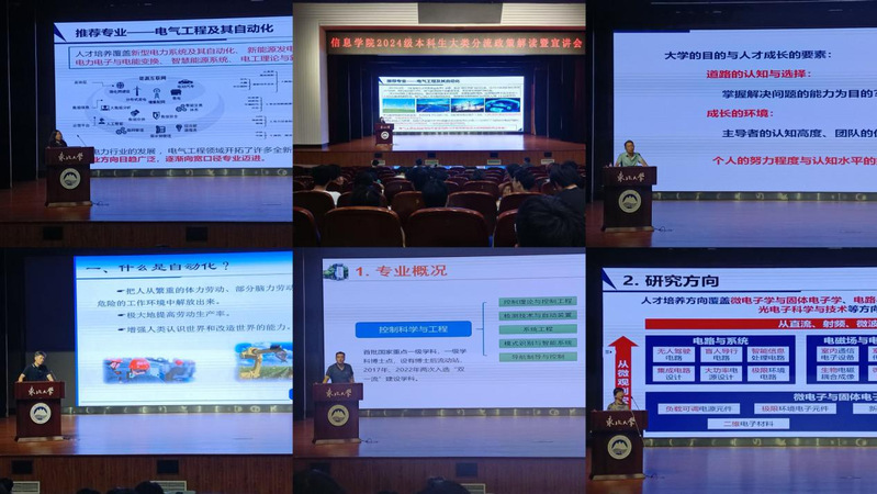 学院电气工程系罗艳红,智能检测与控制系谢植,工业智能与自动化系谭树彬、朱笑晨,电子科学与技术系刘纪红等教师先后介绍了相关专业的建设历程、师资力量、研究方向及成果、人才培养特色、毕业生就业读研等情况,使2024级本科生对自动化大类各专业基本情况和人才培养特点有了深入了解。
