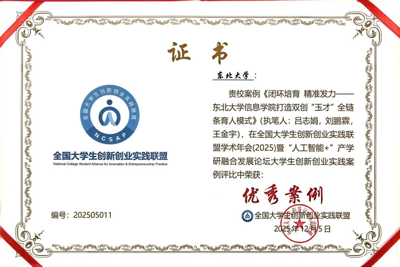 12月4—6日,全国大学生创新创业实践联盟学术年会(2025)暨“人工智能+”产学研融合发展论坛在北京召开。在本次“四优”评选征集中,由信息学院吕志娟、刘鹏霖、王金宇撰写的案例“闭环培育精准发力——东北大学信息学院打造双创‘玉才’全链条育人模式”荣获优秀案例。未来,学院将立足学科特色,以闭环培育为核心逻辑,以精准发力为实施路径,让双创教育走向体系化、全程化,为高校实践育人提供创新范式。